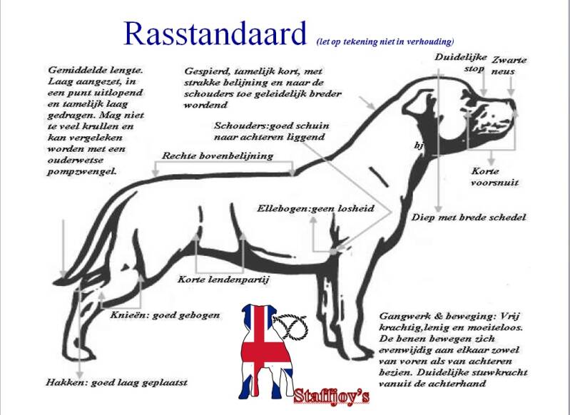 Hieronder treft u de meest recent vertaalde rasstandaard voor de Staffordshire Bull Terrier volgens de opzet van de FCI aan, en daar onder weer de rasstandaard in beschrijvende vorm. Op niet al te lange termijn zullen beide versies via de web-site van de rasvereniging beschikbaar zijn.