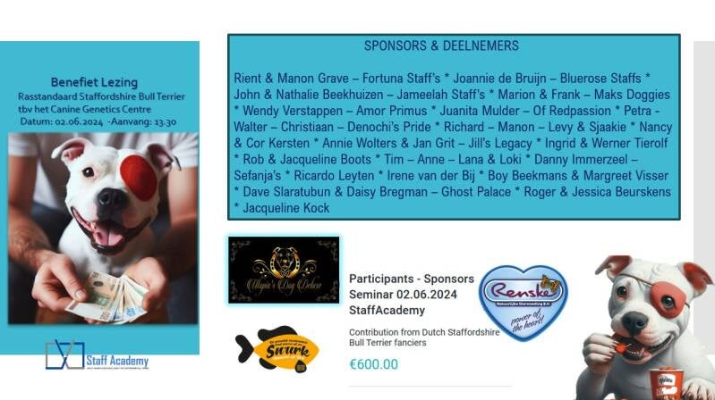 Omdat ik het nu eenmaal erg leuk vind om me bezig te houden met alles wat met de Staffordshire Bull Terrier te maken heeft ga ik onder de naam STAFF ACADEMY dingen oppakken die te maken hebben met kennis & de Staffordshire Bull Terrier .In het verleden heb ik seminars en hands-ons georganiseerd en dat zullen - o.a - ook nu weer activiteiten zijn die "aangeboden" worden. Wat ik echt super vind om nu al te laten weten is dat Staff Academy in samenwerking met Kynokien een cursus/lezing gaat organiseren over kleurvererving en dan specifiek bij de Staffordshire Bull Terrier. Deze cursus/lezing zal online worden aangeboden en bestaan uit twee avonden. Eén avond algemene theorie over kleurvererving en de tweede avond zal (nog) meer ingezoomd worden op de Staffordshire Bull Terrier. Uiteraard zal er een mooie hand-out beschikbaar gesteld worden aan de deelnemers. Deze activiteit is gepland voor het najaar van 2023. Ben je nu al geïnteresseerd en wil je als een van de eerste geïnformeerd worden stuur mij dan een PB-tje met daarin vermeld Kleurvererving en mailadres. Je interesse kenbaar maken is helemaal vrijblijvend, datum, kosten en "voorwaarden" worden op een later tijdstip bekend gemaakt.